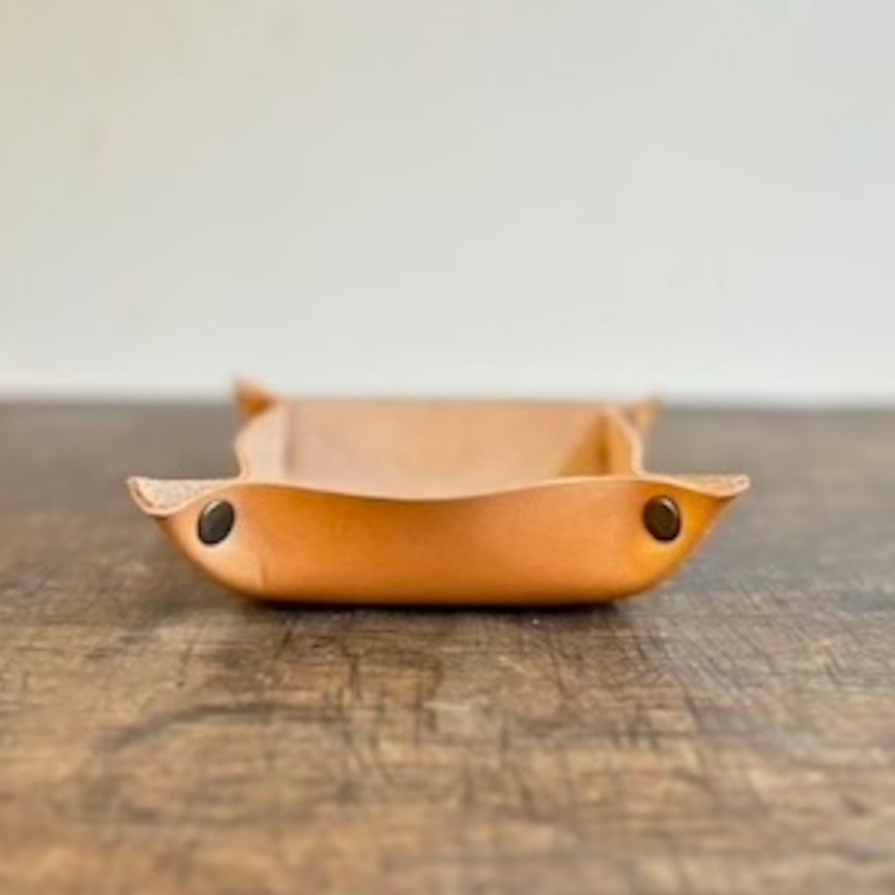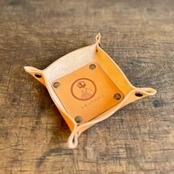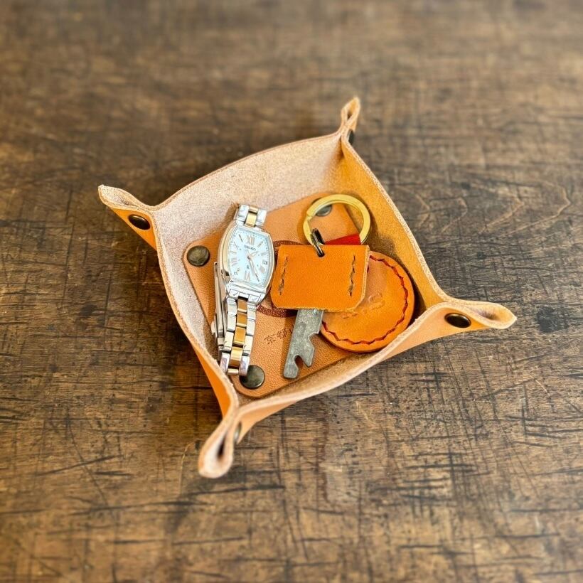 縫わずにカシメでとめた、手作りのレザートレー。